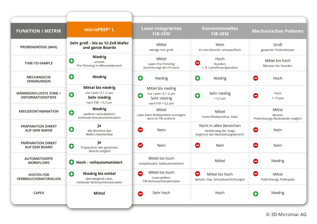 Im direkten Vergleich mit anderen Probenbearbeitungsmethoden zur Fehleranalyse bietet das neue microPREP L-System eine Vielzahl von Vorteilen.